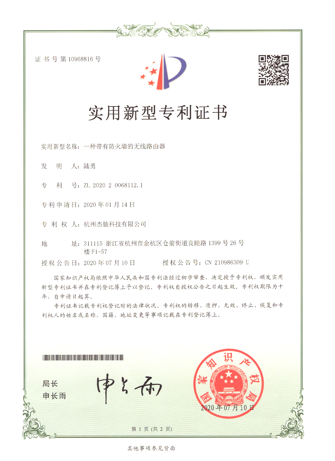 杰馳科技獲取物聯(lián)網(wǎng)專(zhuān)利【一種帶有防火墻的路由器】