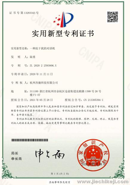 杰馳科技獲取物聯(lián)網(wǎng)專(zhuān)利【一種抗干擾的對講機】